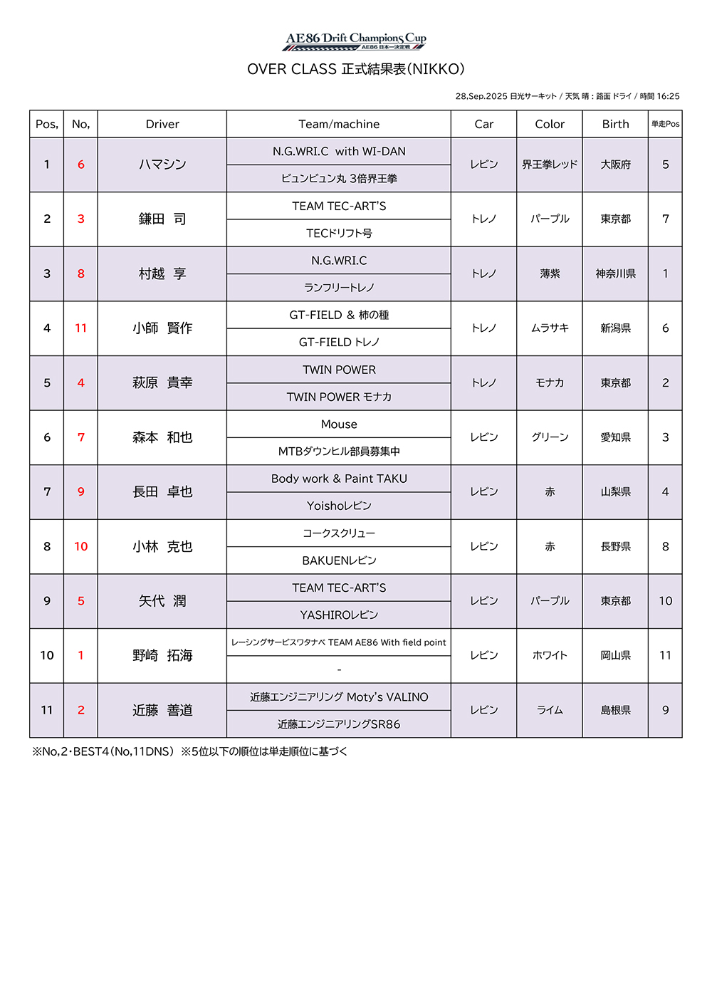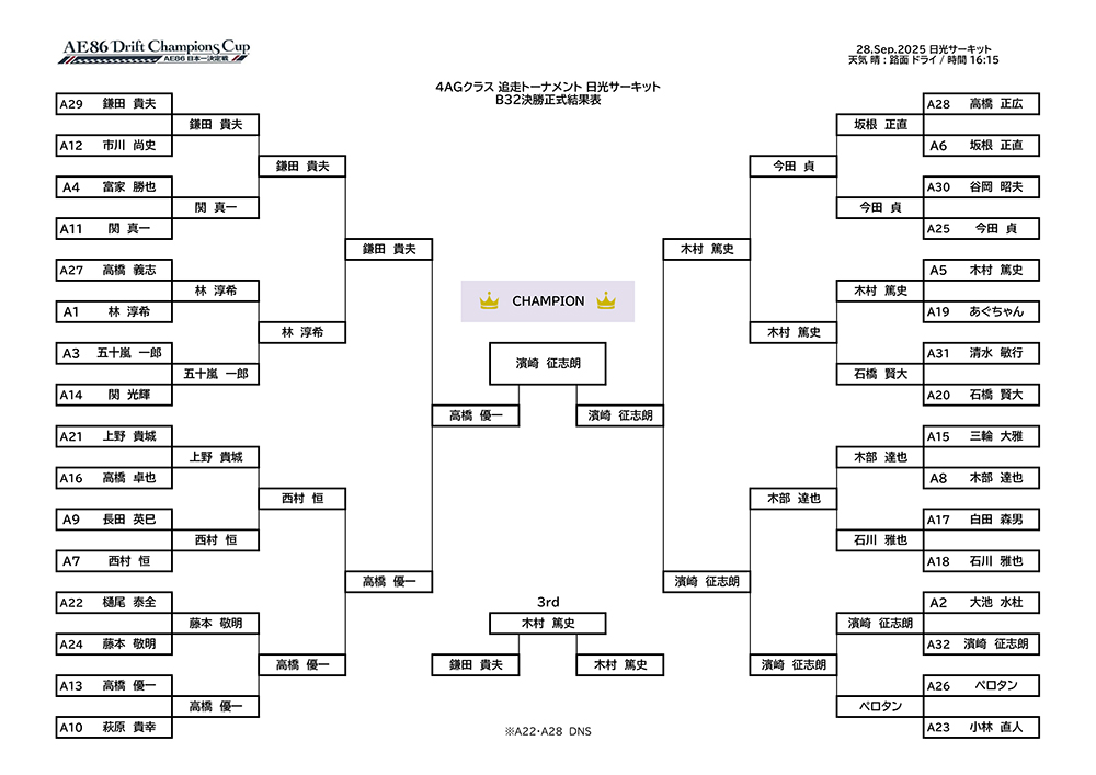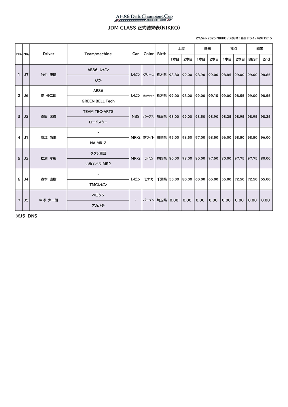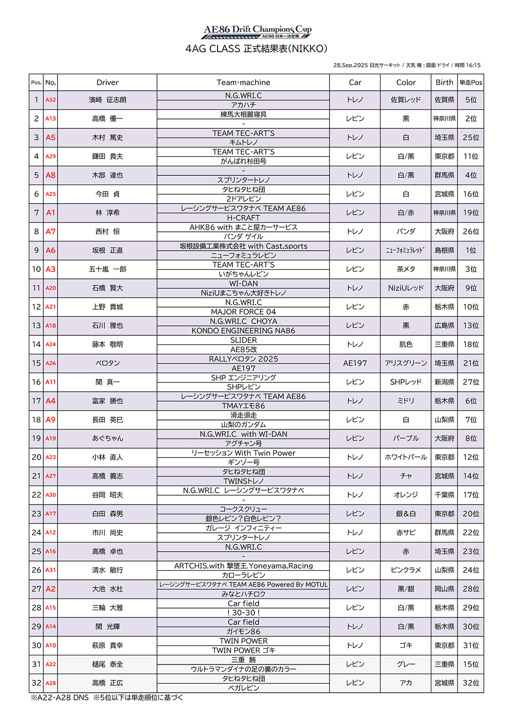 AE86日本一決定戦は今年で5回目、「AE86 Drift Champions Cup」としては4回目の開催になりました。 今回も全国から熱いハチロク乗りが集結いたしました。 大会を支えて頂いたスポンサー様、ご協賛頂いたメーカー様およびショップ様、 猛暑の中、ご参加いただいた参加者様そして出展いただいたメーカー様およびショップ様、 観客の皆様、日光食堂&ケータリングの皆様、本当にありがとうございました。 コース運営およびイベント運営を全面的にサポートしていただいたフルークの皆様、 会場をご提供していただいた日光サーキット様。 このイベントにご協力頂いたすべての皆様に感謝いたします。